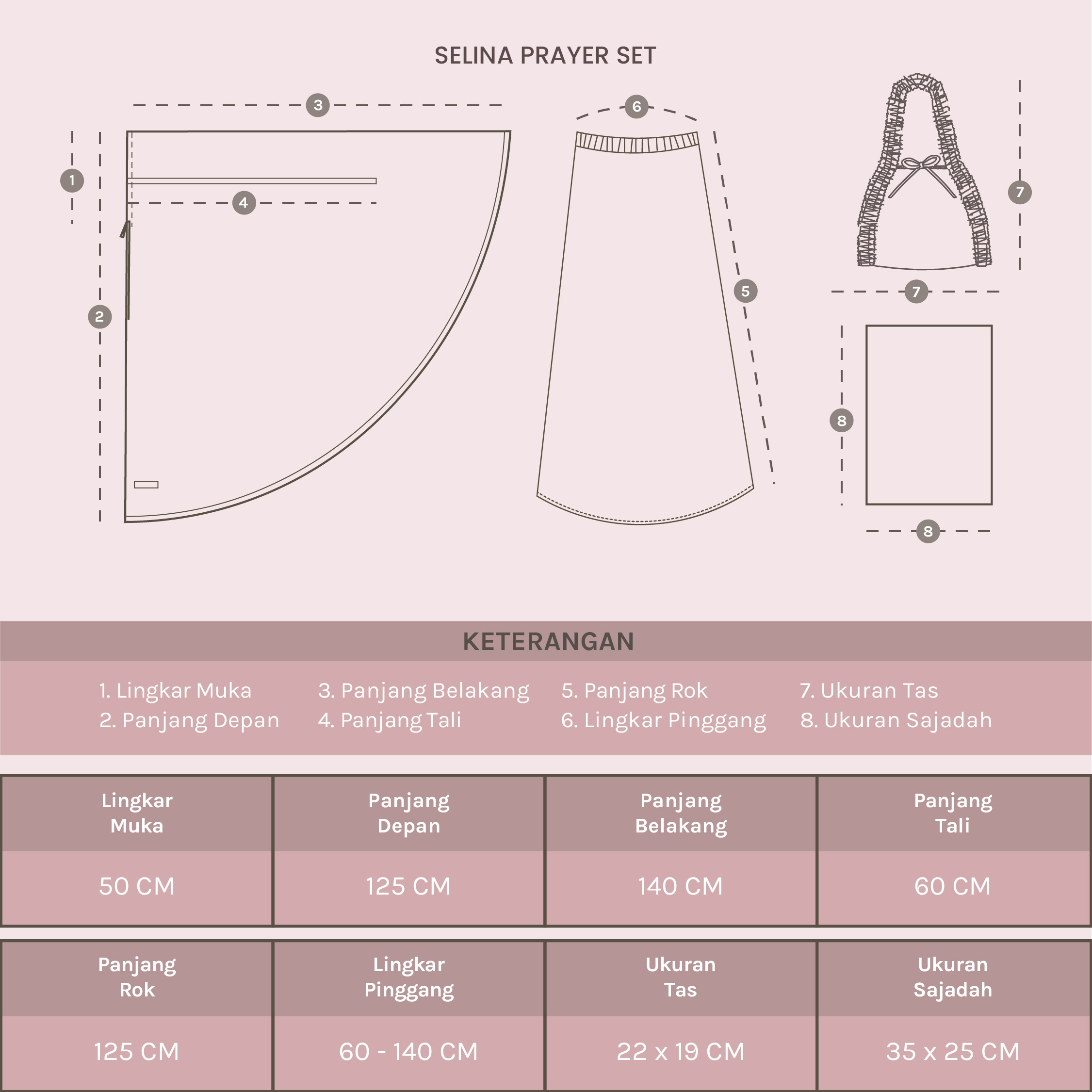 Selina Prayer Set hadir sebagai pilihan mukena elegan dengan bahan silk premium yang lembut, halus, ringan, dan jatuh indah saat dikenakan. Tekstur kainnya adem di kulit, tidak kaku, serta nyaman digunakan dalam waktu lama, baik untuk daily maupun momen spesial seperti hari Raya. Terdapat resleting dibagian muka, sehingga bisa 2in1. Rok mukena memiliki karet pinggang elastis sehingga bisa menyesuaikan berbagai bentuk tubuh dengan nyaman. Set ini juga dilengkapi tas mukena serta sajadah menjadikannya satu paket lengkap yang cantik, fungsional, dan cocok dijadikan pilihan pribadi maupun hadiah istimewa.